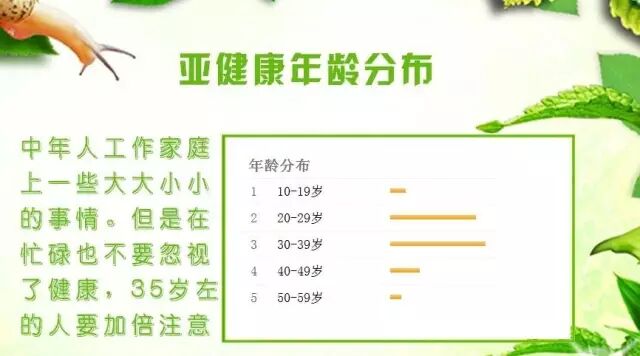 我们看不见摸不着,然而你和你周围能看得见的人很可能正在向“亚健康”的队伍迈入,一份统计资料显示,目前健康人群约占人类10%,疾病人群约占20%,而亚健康人群高达70%。同时发现,处于亚健康状态的人群年龄多在18至45岁之间,其中城市白领、尤其是女性占多数。亚健康是一种临界状态,处于亚健康状态的人,虽然没有明确的疾病,但却出现精神活力、适应能力和反应能力的下降,它最大隐患在于容易提高各类慢性疾病发生的概率,就像人的身体里埋了颗潜伏炸弹。平时不太注意健康,人在过劳的状态下就有可能引发重大问题。猝死是长期的亚健康状态的一种积累。
