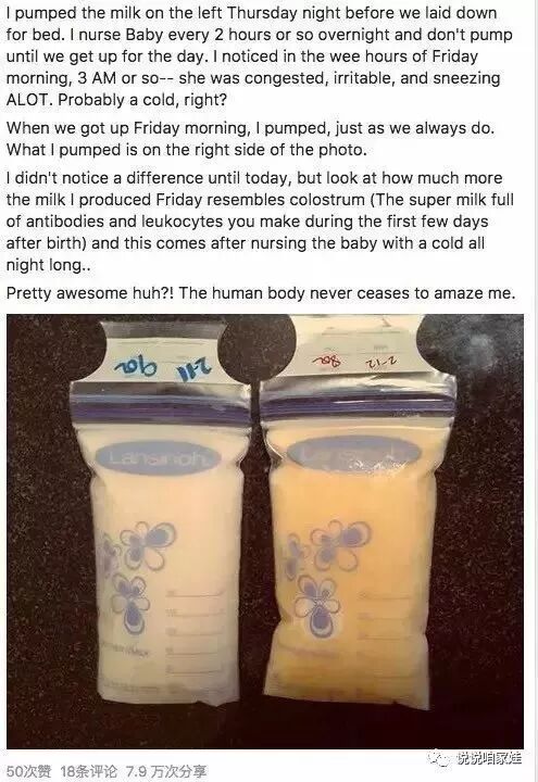 2015年2月,美国facebook上一位叫做Mallory的妈妈火了一把,因为她晒出了她的宝宝感冒前和感冒中自己挤出来的母乳。