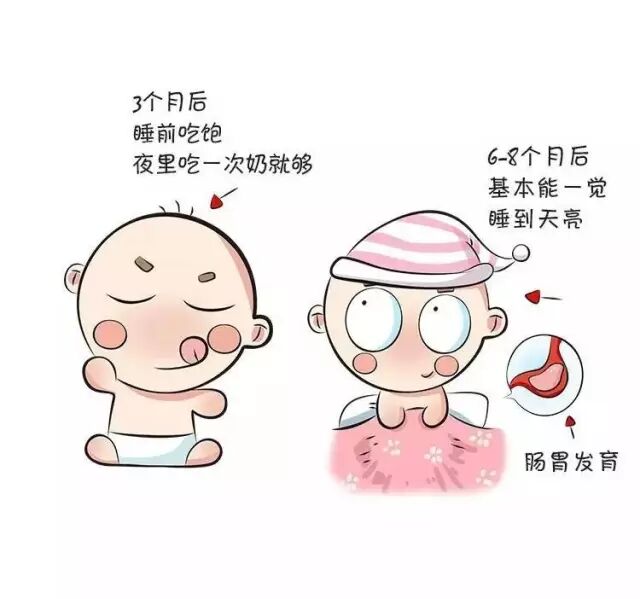 差不多3个月后,好多宝宝睡前吃饱了,夜里吃一次奶就够了,顺手培养他夜里睡长觉的习惯;6-8个月后宝宝吃奶效率和肠胃发育都上来了,基本上能一觉睡到天亮,夜里很少需要吃东西了,顶多饿得不行偶尔喂一次……这也是大部分宝宝的状态。