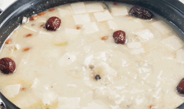 ④加入南瓜、山药、和剩下的高汤,大火煮开转小火熬15-20分钟,加盐、胡椒粉、鸡精适量就可以了。