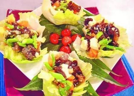 5、卷心生菜去根洗净,取4片成碗状摆在其中,将炒好的菜倒在生菜碗中即可。