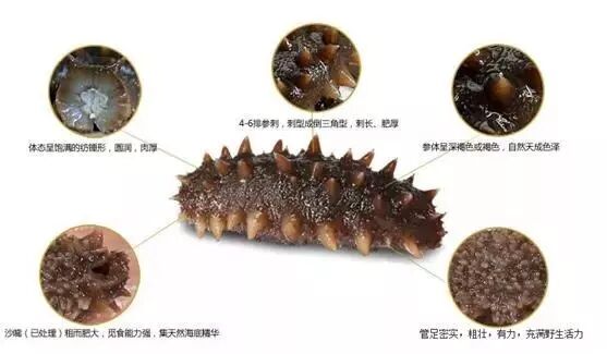 望:海参的体色主要与栖息环境有关,一般呈褐色,但生活在岩礁附近的海参与生活在泥沙、碎石底的海参相比较,前者的颜色往往较深。而生活在海藻间的,常带有绿色,有时变成赤褐色或紫褐色。所以,颜色决定不出海参的好坏。只要看参刺是否粗壮而挺拔。