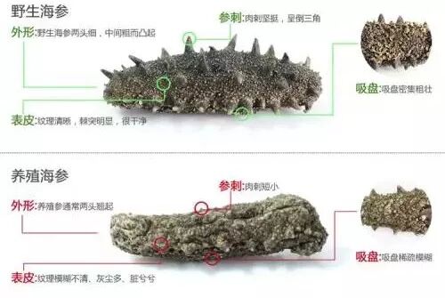 海参底足:底播野生海刺参一般生长在水深20米左右的海域,通过底足行动来寻找食物,所以底足长得短而粗壮;而圈养的海参因为长期使用养殖人员投放的饵料不需要移动,且生活在浅水区域,底足的行动作用下降,吸附力差,变得细长。