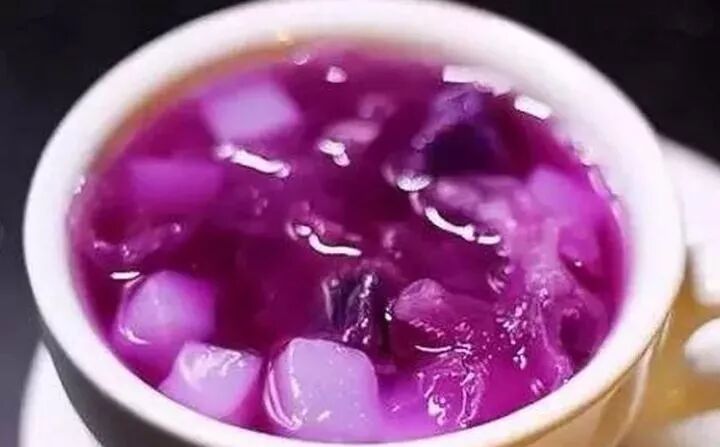 把去皮蒸熟的紫薯放入豆浆机,加入开水、牛奶等一起打成汁,待稍微冷却之后加入蜂蜜饮用。