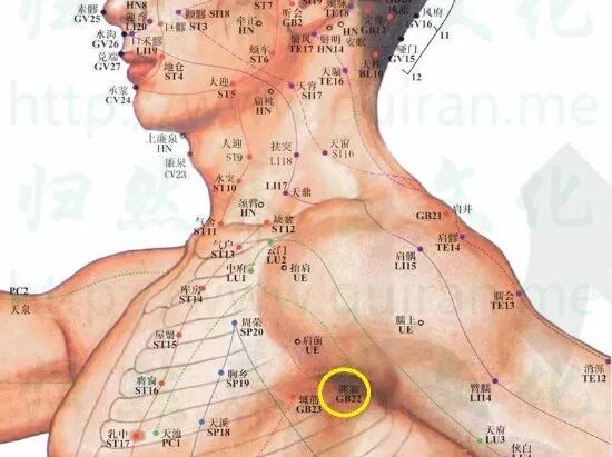 渊腋穴在人体的侧胸部,处于腋下中线的下方3寸的位置上,咱们可以用食指和中指来按揉这个穴位,当然不知道有些妈妈会不会怕痒,怕的话就轻点,揉个20次就好了。