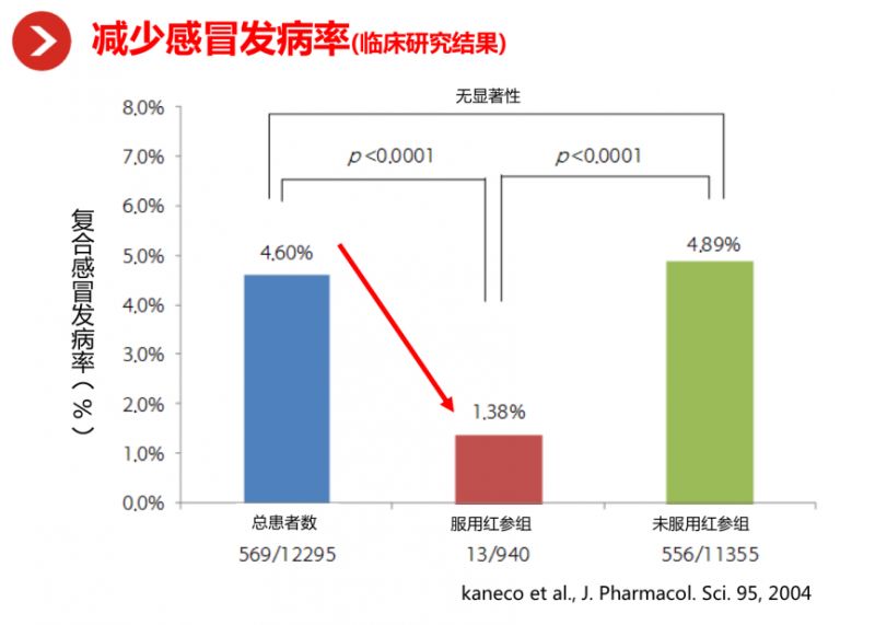 针对12,000多名患者进行的患感冒比例调查结果显示,红参服用者的患病率为1.4%,红参未服用者则为4.9%,服用红参不仅不易患感冒,而且即使患上感冒也更快缓解相关症状。