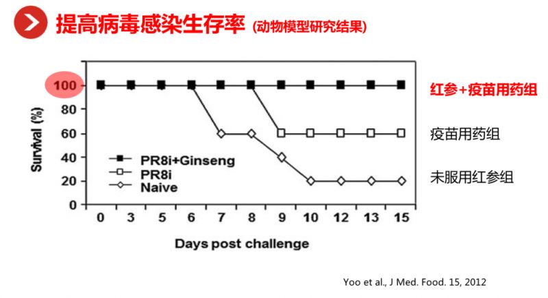 实验结果显示,未投入红参组的生存率为20%,投入疫苗组的生存率为60%,同时投入红参及疫苗组全部存活,生存率为100%!