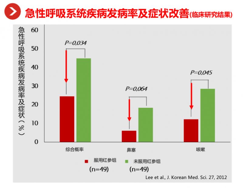 针对100余名成人进行的急性呼吸器官疾病发病率及症状的调查结果显示,摄入红参时急性呼吸器官发病率降低了50%,咳嗽、鼻塞等症状也得到了改善。
