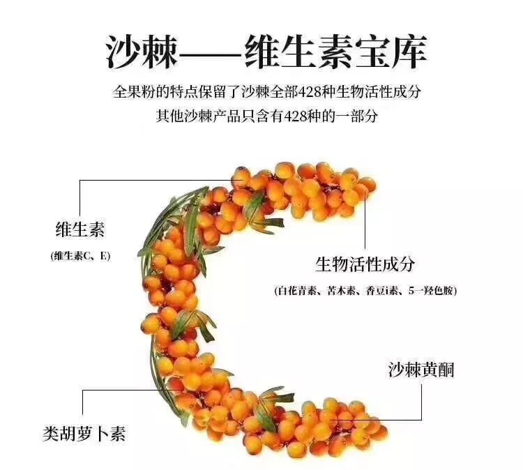 沙棘生长在海拔3千---4千的高寒地带,生活环境恶劣,昼夜温差大,它的根系非常发达能伸到地下30米,吸收地下的矿物质和微量元素,小小的果实含有生命活性物质428种,集中了目前人类所发现的所有的活性物质、营养素。都知道松花粉、芦荟、虫草吧?松花粉的活性成分有260种、芦荟有180种,虫草有120种,虫草的价格上千元,但沙棘呢?沙棘拥有428种活性物质。