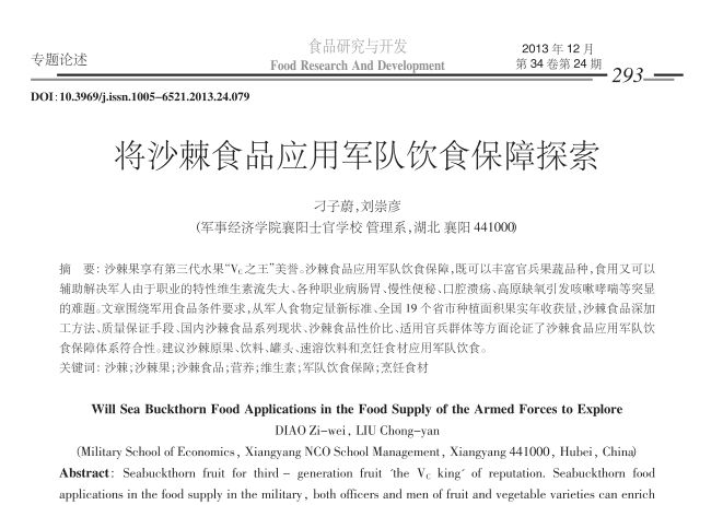 其实,我国早就已经开始研究沙棘食品军用,2013年《食品研究与开发》指出:沙棘食品应用军队饮食保障,可以辅助解决军人由于职业特性维生素流失、各种职业病成为、慢性便秘、高原缺氧引发的咳嗽哮喘等突显难题。