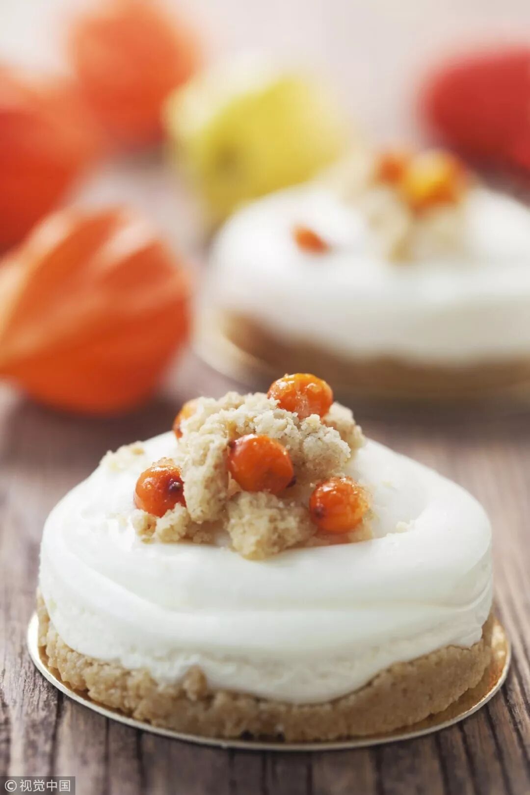 糖渍的沙棘果点缀在蛋糕上,
