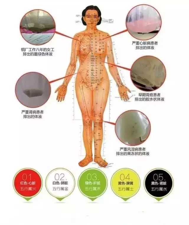 通过中医五脏对五色的原理,各种颜色的汗液毒素可以判断出每个人身体存在的问题,从而解决由于经络淤堵导致的身体问题。