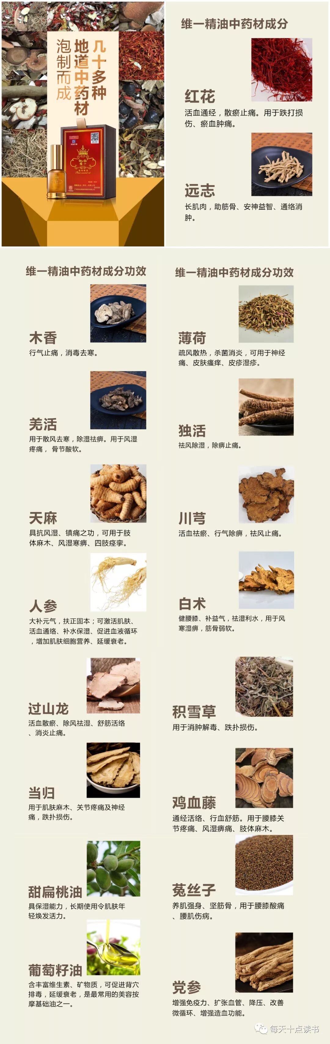 白云山维一植物精油,由几十多种中草药浸泡提炼而成,成份有人参,红花,远志,木香,天麻……等多种经络养元地道古方,结合现代高科技精纯提取技术及药物纳米渗透科技。