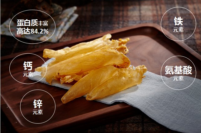 鱼胶以富有胶质而著名,素有“海洋人参”之誉,其主要成分为高级胶原蛋白、多种维生素及钙、锌、铁、硒等多种微量元素。