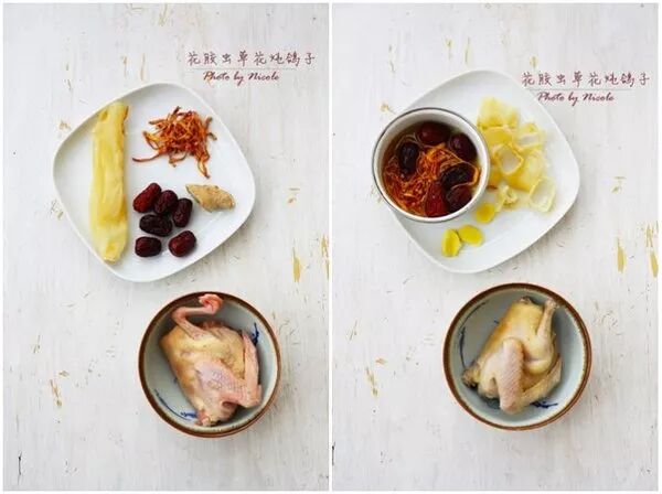 主料:老鸽1只、花胶2个、红枣50G、虫草花10G