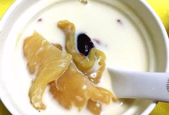 材料:花胶50g,牛奶600g,红枣2粒,枸杞数粒,冰糖适量。