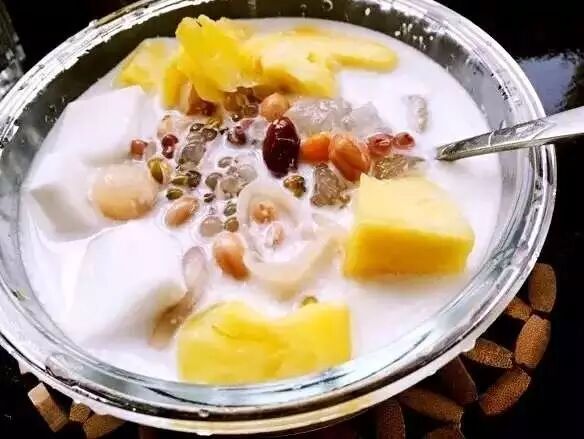材料:花胶、椰汁、牛奶、菠萝、西米。