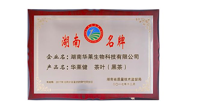 20. 2018年4月21日,湖南名牌产品授牌仪式暨安化县首届“质量论坛”在仙溪镇召开。“华莱健茶叶(黑茶)”继2014年获得“湖南名牌产品殊荣”后再次获得该项荣誉,也再一次验证了公司产品的优秀品质在消费者心目中的地位,充分彰显了公司的强大实力和在行业内的影响力。