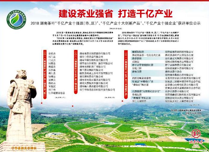 1.2018年9月7日,2018第十届湖南茶业博览会将在长沙红星国际会展中心南广场隆重开幕,会授予华莱生物科技有限公司“千亿产业十强企业“称号。