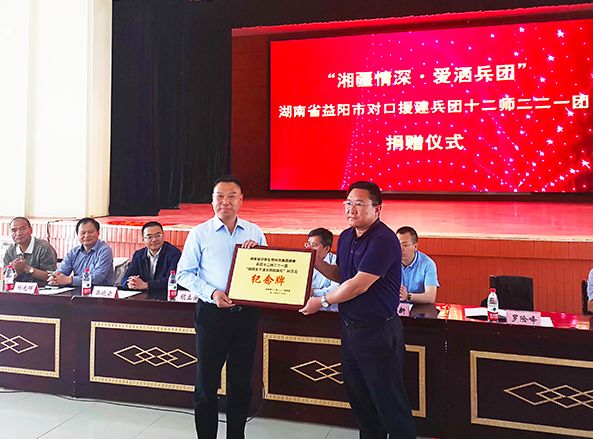 15. 2018年5月25日,中共益阳市委书记、市人大常委会主任瞿海率后方援疆工作组在第十二师221团出席“湘疆情深·爱洒兵团”对口援疆捐赠仪式。兵团党委、兵团副秘书长、湖南省援疆前方指挥部副指挥长胡建新,师党委常委、副师长吕晓云及师团两级相关人员陪同参加捐赠仪式,湖南华莱董事长陈社强代表公司出席捐赠仪式,现场为221团学校捐赠助学金20万元,为221团太阳能路灯项目捐赠80万元。