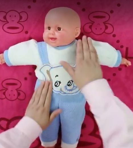 小宝宝平躺,用手掌根部以宝宝肚脐为中心,顺时针按摩宝宝的小肚子,注意力度,不要压迫到胃部,以免引起吐奶。建议1-5分钟。
