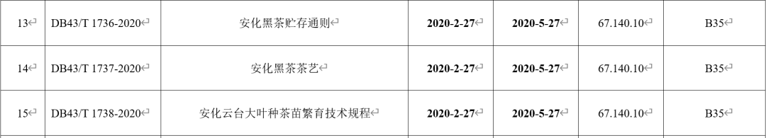 湖南省发布《安化黑茶贮存通则》《安化黑茶茶艺》《安化云台大叶种茶苗繁育技术规程》等3个地方标准,将于今年5月27日实施。至此,“安化黑茶”已具有8项国家标准、17项地方标准,打造了安化黑茶从种植、加工、生产、冲泡等涵盖一、二、三产业的标准规范。