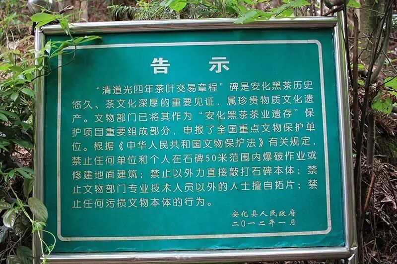 为保护禁碑,安化县政府在旁边树立了一块告示牌,为见证安化黑茶历史悠久、茶文化深厚的重要见证,对些珍贵文物。安化文物部门已申报为全国重点文物保护单位。根据《中华人民共和国文物保护法》,禁止任何单位和个人在石碑50米范围内爆破作业或修建地面建筑;禁止以外力直接敲打石碑本体;禁止文物部门专业技术人员以外的人士擅自拓片;禁止任何污损文物本体的行为或移动本体。