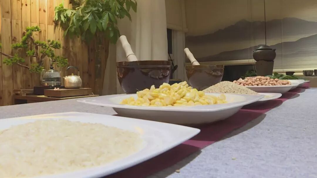 梅山擂茶的主要配料有:大米、新鲜玉米、生芝麻、生花生、生姜还有新鲜的茶叶。