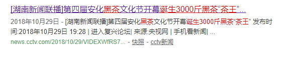湖南卫视新闻联播先后推出报道《第四届湖南·安化黑茶文化节开幕》、《3000斤黑茶“茶王”诞生》,点击量均突破1000万。