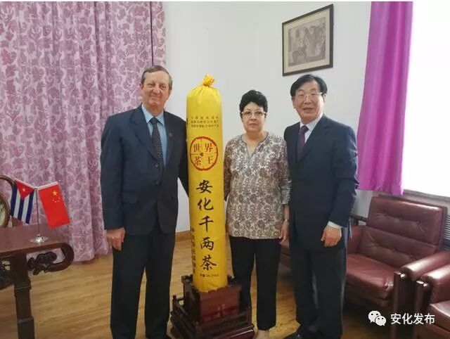 在古巴驻华大使馆,大使和夫人十分高兴地接受安化县赠送的安化黑茶。