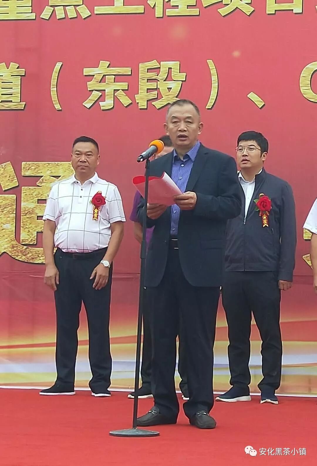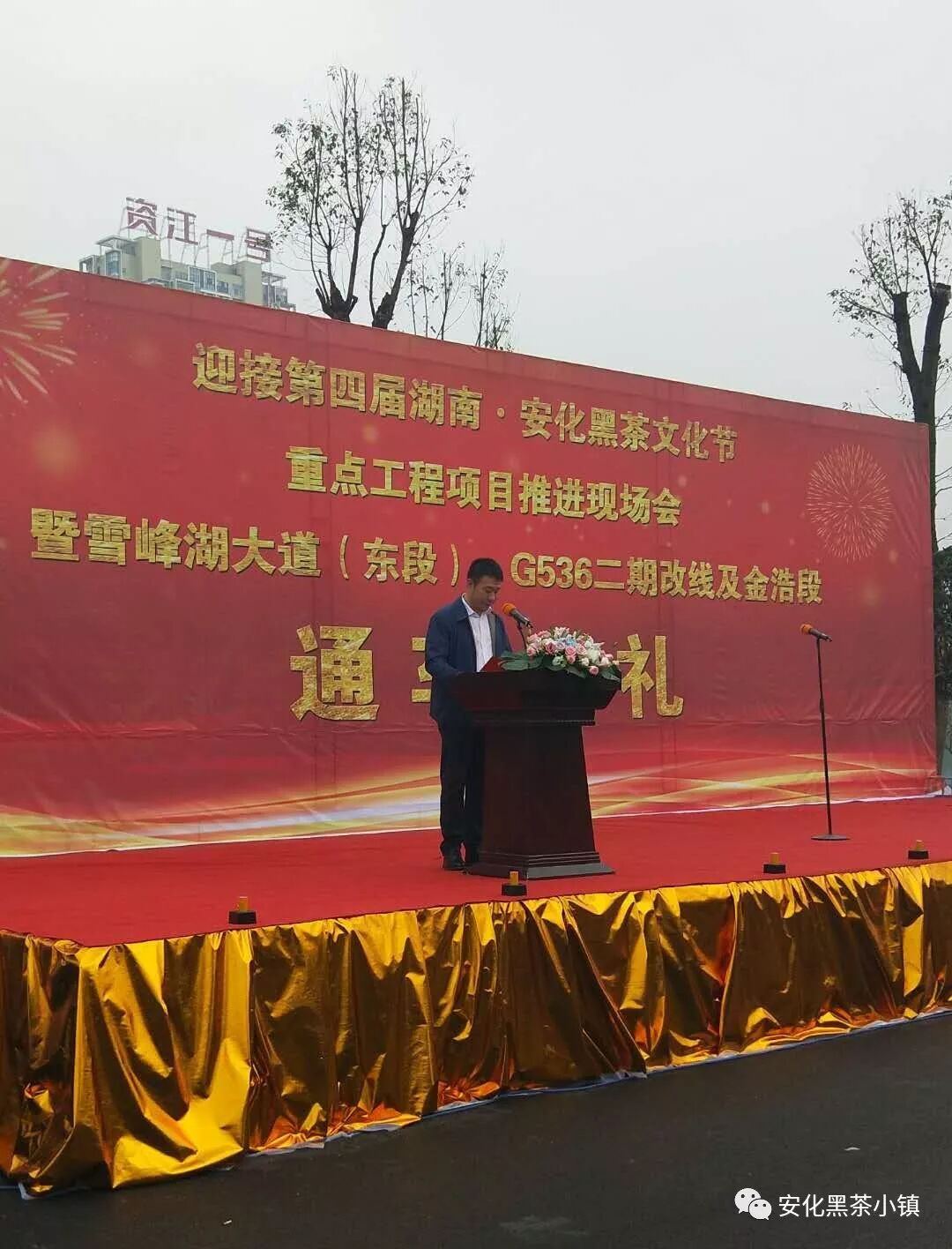 9月28日,安化县委、县政府举行迎接第四届湖南·安化黑茶文化节重点工程项目推进现场会暨雪峰湖大道(东段)、G536二期改线及金浩段通车典礼,县委副书记、县长肖义宣布“雪峰湖大道(东段)、G536二期改线及金浩段通车”!县委常委、常务副县长邹雄彬,湖南华莱生物科技有限公司董事长陈社强在典礼上致辞,并和出席庆典的县领导一同为通车典礼剪彩。标志着安化黑茶特色小镇建设初见成效。