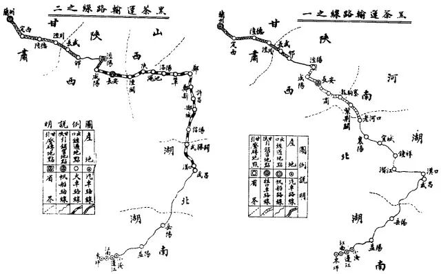 山西茶商在湖南安化贩茶运往恰克图的路线,则为水陆两路:一路由常德、沙市、襄阳、郑州入山西泽州(晋城),北上抵张家口转恰克图;一路穿洞庭湖由岳阳入长江,下水至武汉,转汉水上抵樊城,起岸北上,经河南、山西抵张家口后转恰克图。