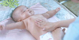 以孩子肚脐为中心,双手分别从左下滑向右上(相当于孩子腹部的右下到左上),两只手交替以顺时针方向进行按摩,做 3~5 次。