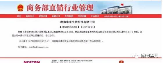 三、2017-06-20 商务l部对湖南黑l茶直销经营许申请材料已经符合受理条件,予以公示。