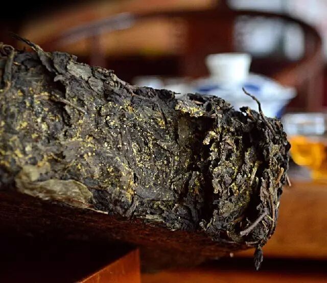新茯砖茶“金花”茂盛而有些老茶“金花”较少。“金花”是茯茶在加工过程中产生的,在不同阶段“金花”看起来可能有差异,刚出烘房的新茯茶,砖身内有大量的金黄色颗粒,形似“米兰”;随着陈放年代的延长,金花逐步萎缩变白,三十年以上的茯茶已基本见不到金花,隐约可见白色欠均匀的斑点。虽然“金花”的形态发生了变化,但其一直处于活跃状态,茶多酚等的氧化反应一直在进行,黑茶这种随着年代久远而其茶叶品质、药理特性却在增强的特性,使得人们更加关注它。茯砖茶内颗粒饱满的“金花”。