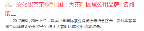 2017年2月17日上午,湖南省人民政府举行新闻发布会,在长沙颁发首届湖南省十大农业(区域公用)品牌,安化黑茶作为区域公用品牌名列榜首。