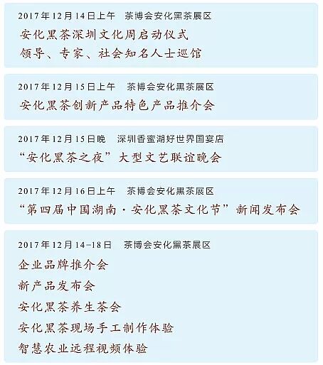 此次安化黑茶深圳文化周将于12月14-18日在深圳会展中心隆重举办,具体看点如下: