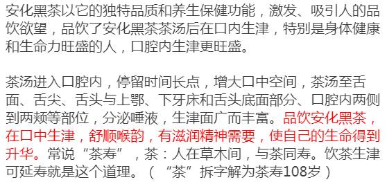 安化黑茶的甜与回甘,乃其味感之极至,与采用成熟的茶叶原料有关。安化黑茶饮入口内的回甘味、淡然甜意是那么清爽、清雅,不仅对健康有益,还可以满足心中对甜味的馋渴,将品尝安化黑茶提升到艺术境界。特别是采用“核心区”等云雾山地区域的茶叶原料制作的各类茶品,最为上品,如果再陈化一定年份,那种陈韵、那种甘甜味留在口腔内,会久久不散,这才是真正享受到品安化黑茶的甘甜清爽、滋润清心,一种自然甘甜美感从心底油然而生。