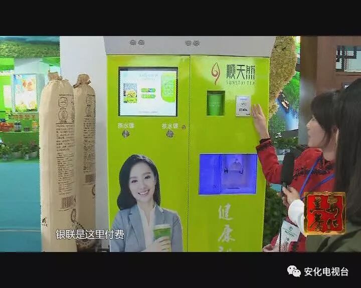 顺天然茶业市场部经理张志云说:“我们这个机器是顺天然安化黑茶研究院历经四年研究出来的,有48个专利 。这个机器操作起来是非常简单的,按下茶水键 这里有一个扫码和银联标志。银联是这里付费 扫码按这里 。然后这里杯子全都有 。