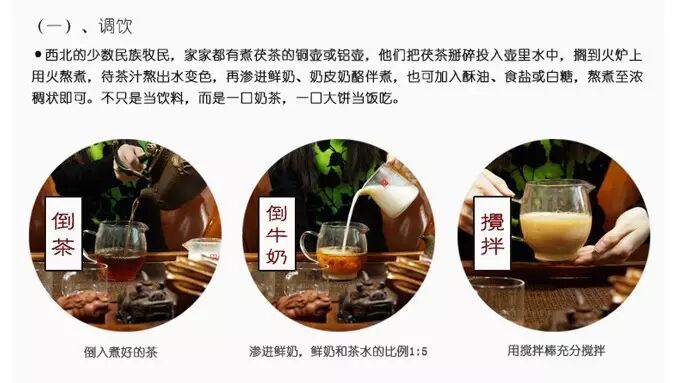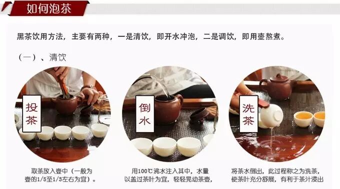 3、冲泡技巧:根据茶品特点适时调整投茶量、茶水比、浸泡时间(如黑砖茶砖身较紧实,冲泡时间宜稍长,散茶如天尖宜较快出水),投茶多、加水少、浸泡时间长则浓。冲泡策略:减少投茶量、快速出水。