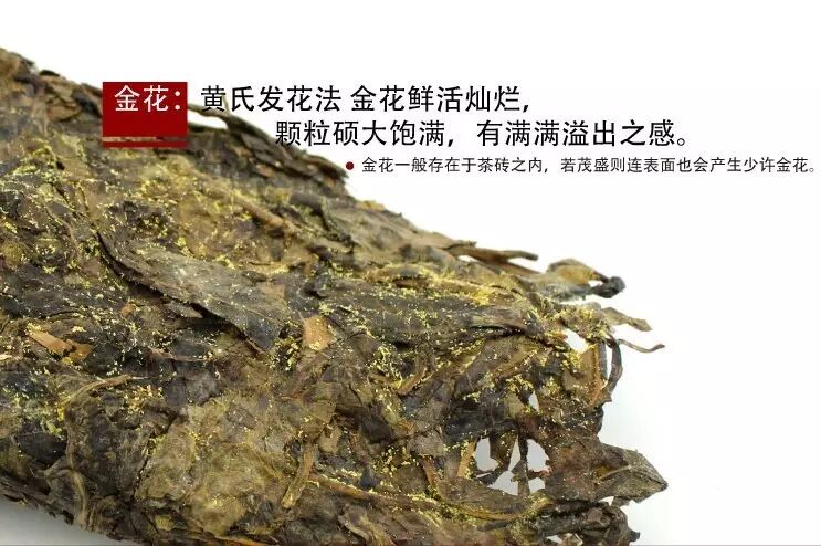 “金花”是黑茶在安化当地特定环境条件下,通过“发花”工艺自然长成的益生菌体,专家命名为“冠突散囊菌”,具有较强的降脂降压、调节糖类代谢等功效。