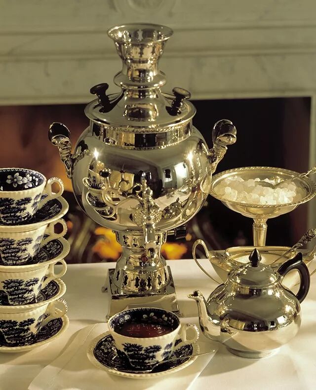 在俄罗斯,泡茶往往会使用一种叫做“茶炊”的茶具。茶炊也叫茶汤壶,一般是银质或铜质的,有内外两层壁,中间加热,四周灌水,与传统的炭炉火锅有点像。下面还有水龙头和支撑腿,便于倒茶。