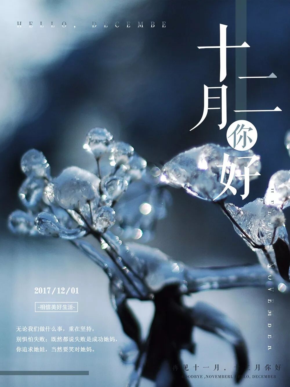 1、最痛苦的不是失败的泪水,而是不曾竭尽全力的懊悔,别让明天的你,讨厌今天的自己,十一月再见,十二月:你好,别来无恙。还有一个月,想做什么依旧来得及!12月,早安!