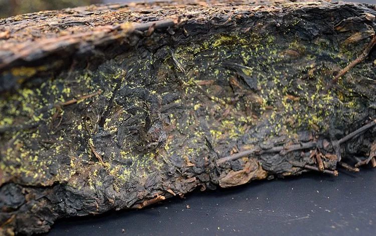 黑茶茯茶以金花闻名于世。"金花"是一种黄色颗粒状菌体,学名“冠突散囊菌”。茯砖茶最重要的一道工序就是“发花”,金花茂盛、色泽鲜艳、呈金黄色,是茯砖茶的重要品质要求。“金花”生长好的茶滋味醇和,经过在加上后期的转化,苦涩味逐渐褪去,更能去油腻,利消化。
