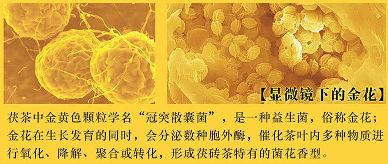 茯砖发花是茯砖茶的特征性工艺,即在一定的温湿度条件下,优势菌_冠突散囊菌(Eurotioumcristatum),【俗称“金花”】,在砖身中生长和繁殖。冠突散囊菌是对人体无任何毒性的一类活性真菌,通过代谢可产生一系列对人体有利的功能性化学活性物质,如脂肪分解酶,蛋白质降解酶。a-淀粉酶,多糖化合物,脂肪分解酵素。