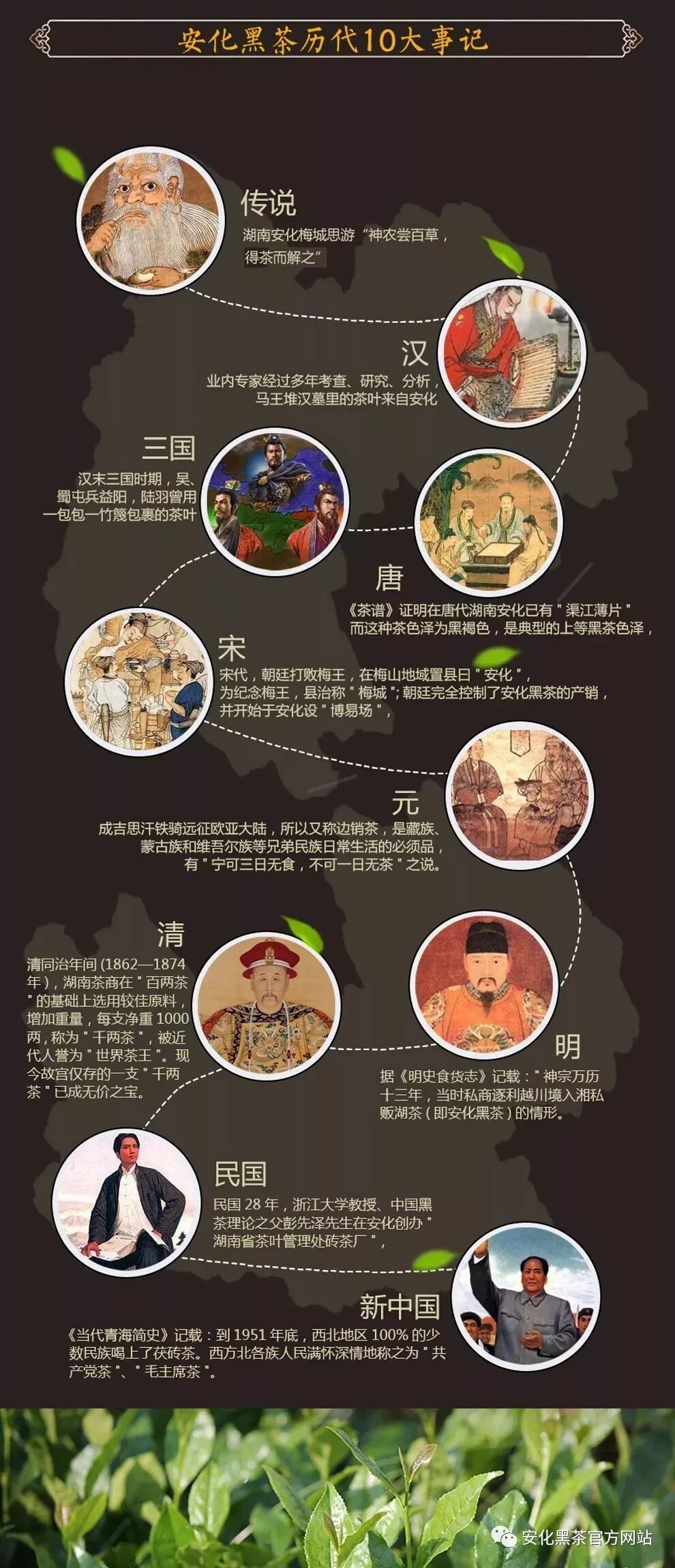 安化黑茶因产自中国湖南益阳安化县而得名。据历史文献记载,安化黑毛茶的加工技术的创新发生在明代中期(十五世纪)以前,当时安化、桃源一带茶农改变四川“乌茶”加工中将绿毛茶潮水,长时间堆积“做色”后蒸压成块的做法,改用锅炒杀青,趁热踹揉沤堆(渥堆发酵),七星灶松柴明火干燥等技术加工黑毛茶,这种初制过程中进行“渥堆发酵”生产黑毛茶的工艺,成为此后黑茶加工的经典工艺与核心技术,奠定了现代黑茶加工的技术基础。