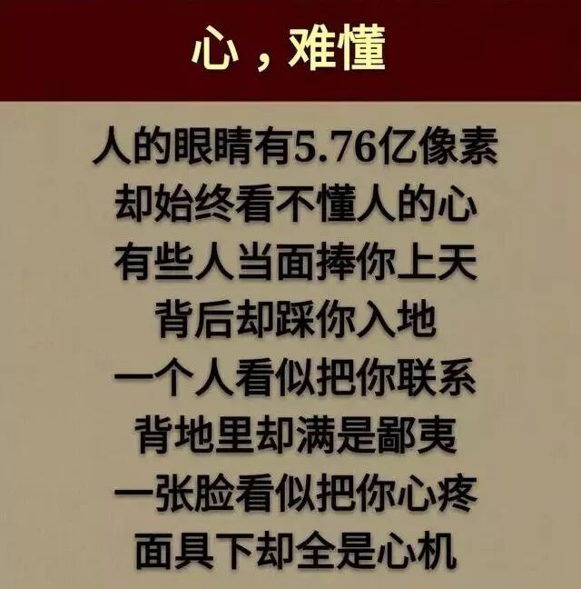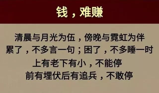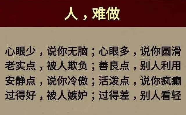 钱,难赚;情,难断;话,难辨;心,难懂;人,难做;命,难求!