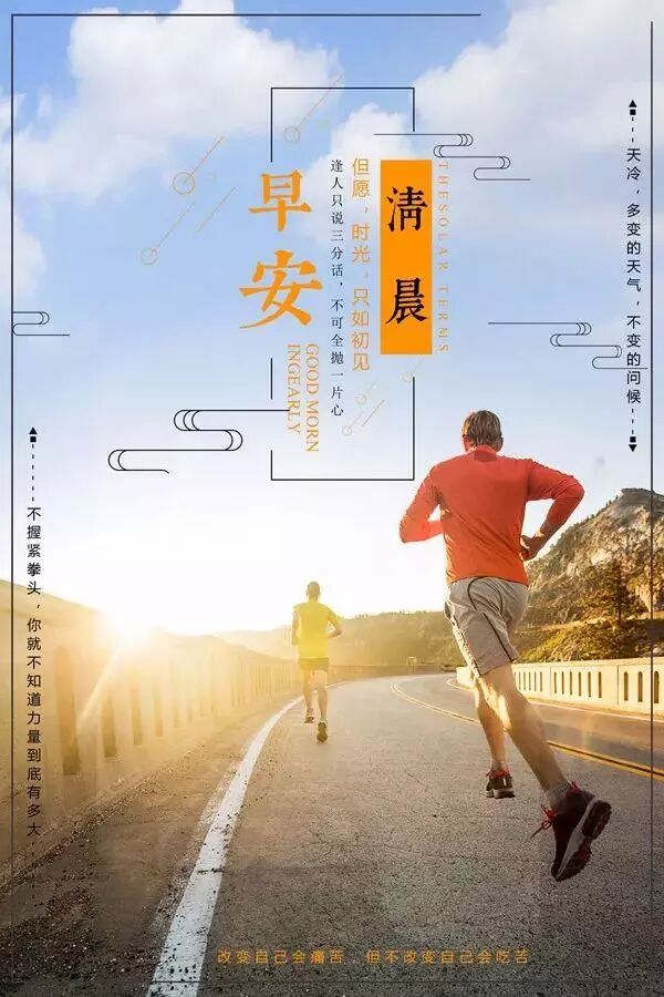 早安!我喜欢两个词:一个叫用心,一个叫执着。用心的人改变自己,执着的人改变命运。只要坚持在路上走,就没有到不了的将来!加油!