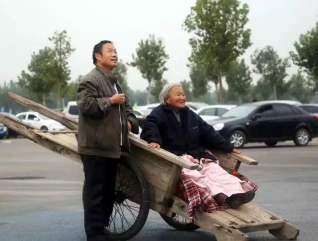 山东,儿子用板车推着八十多岁的老母亲,一路说说笑笑、走走停停。