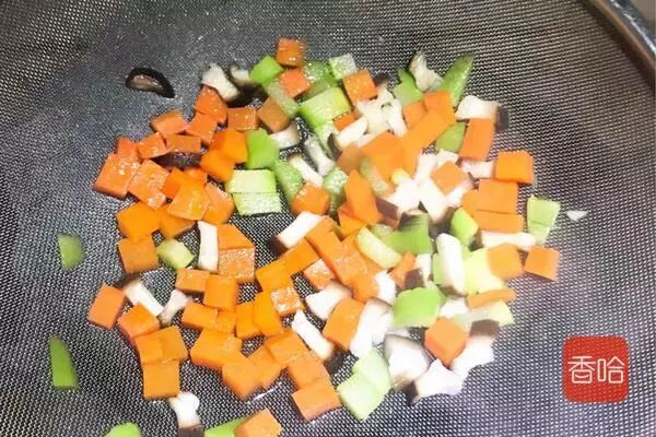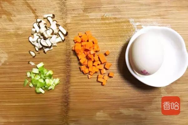1.主要食材。香菇、芦笋和胡萝卜切细丁。